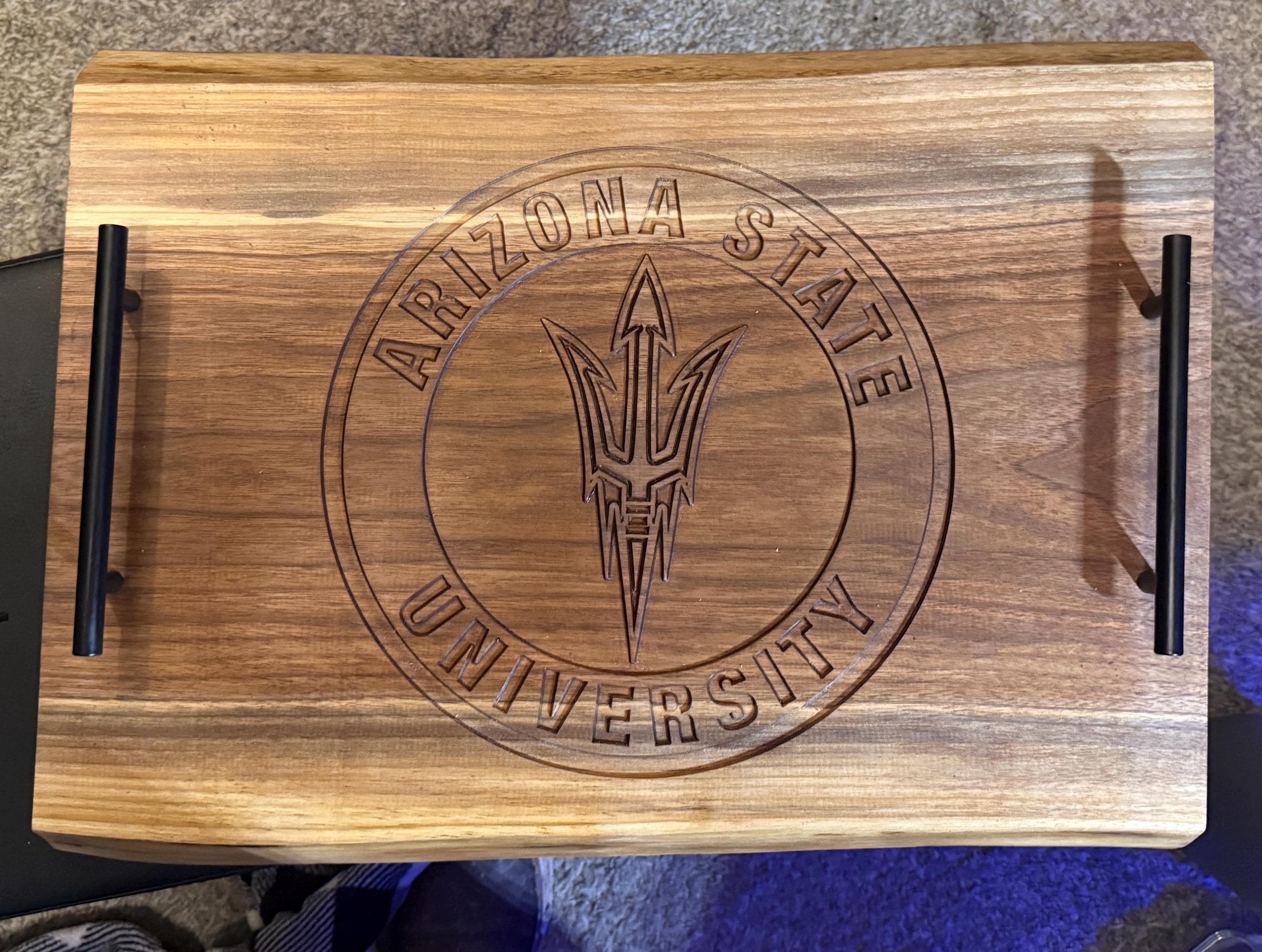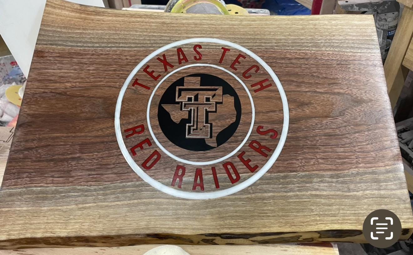 Made-to-Order College Team Logo Carved Charcuterie Board. It is made from "Live edge" Black Walnut and measures 20" x 13" x 1". Colored epoxy fill can be added for an additional fee. This looks great, but also adds filler in the carved out areas. I treat these with simple mineral oil and the are Food Safe.