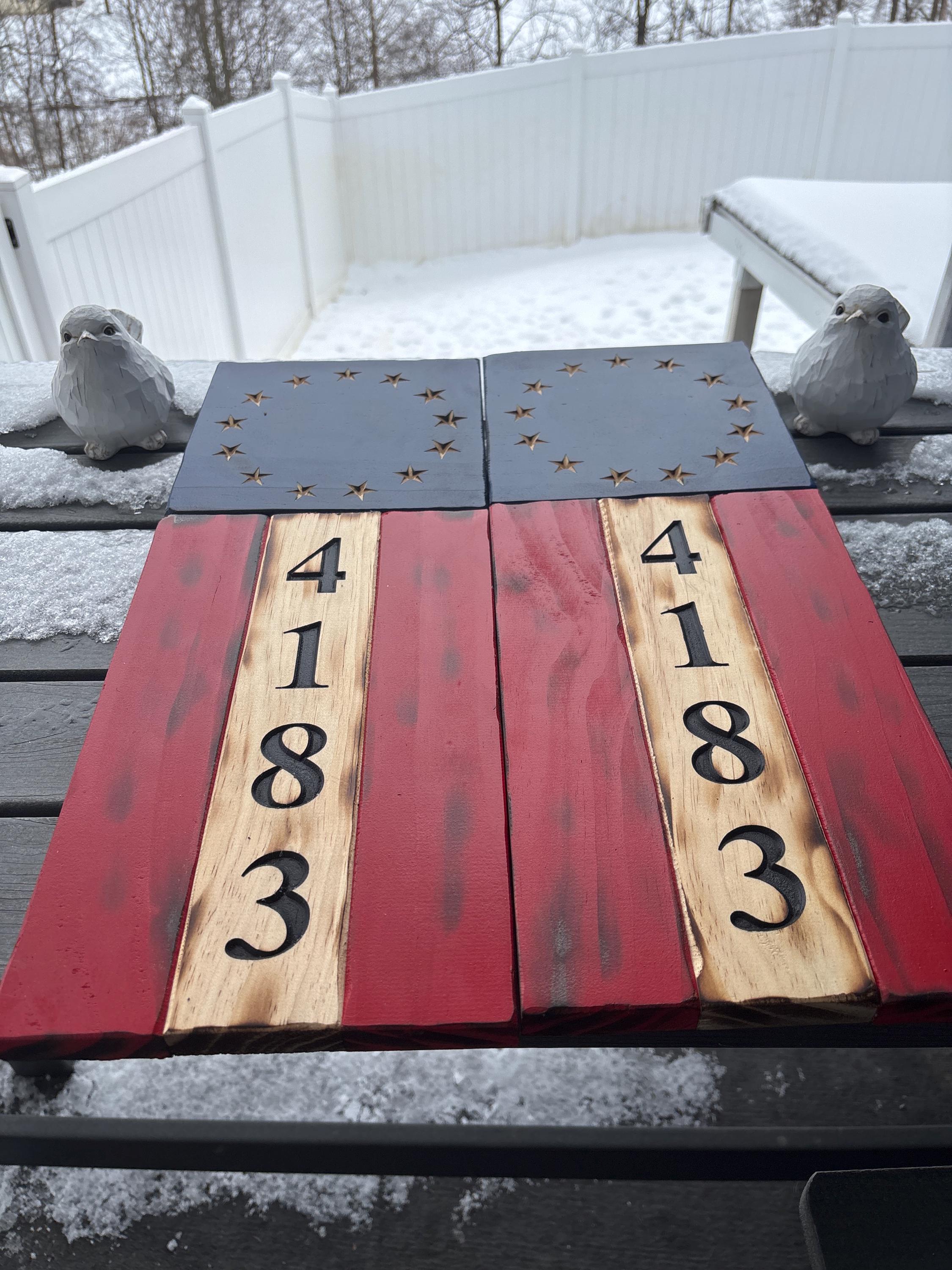 Veteran Hand made custom American Flag House Sign. This sign is 7.5” x 29”. Size can vary based on number of digits in address. We can also make the Union with circle of stars. Pricing includes numbers carved with CNC Router, free shipping, and 3 coats of exterior polyurethane. I also used reflective clear paint to cover the numbers for better visibility at night.